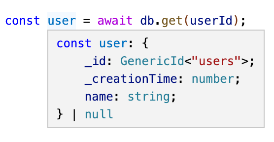 In the example above, userId is an Id that references a document in the "users" table (Id<”users”>). When this Id is passed to db.get, Convex loads the corresponding user document. You can see here that TypeScript now automatically infers the type of user!