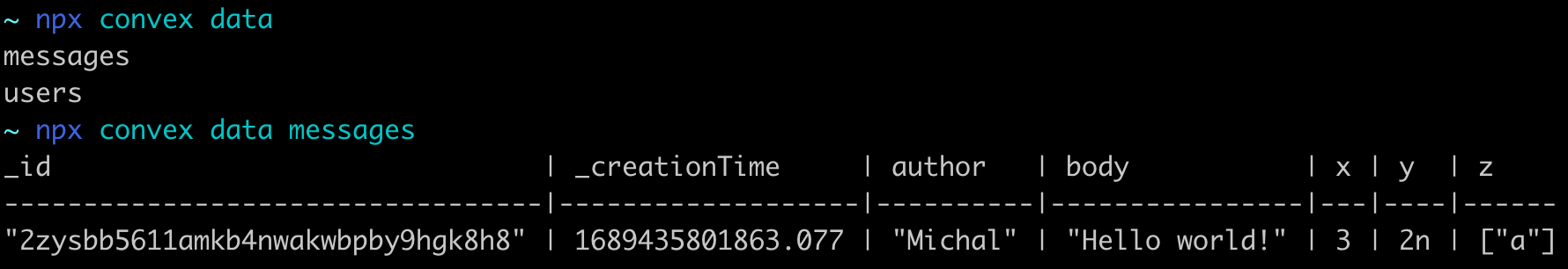 The new npx convex data command allows viewing data stored in your deployment’s database without having to use the dashboard: