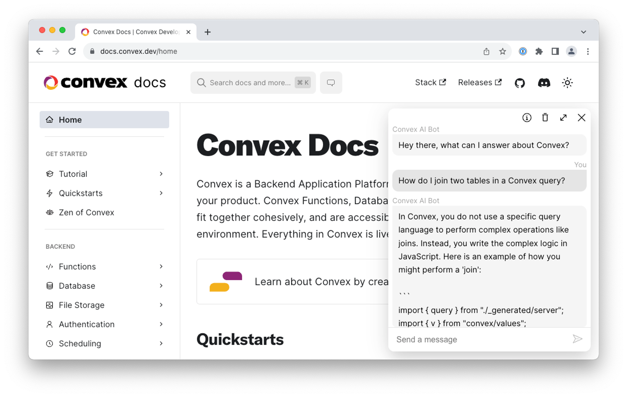 Many developers have built AI-powered assistant experiences on Convex and we wanted to join in! You can now ask questions about Convex documentation directly from docs.convex.dev.
