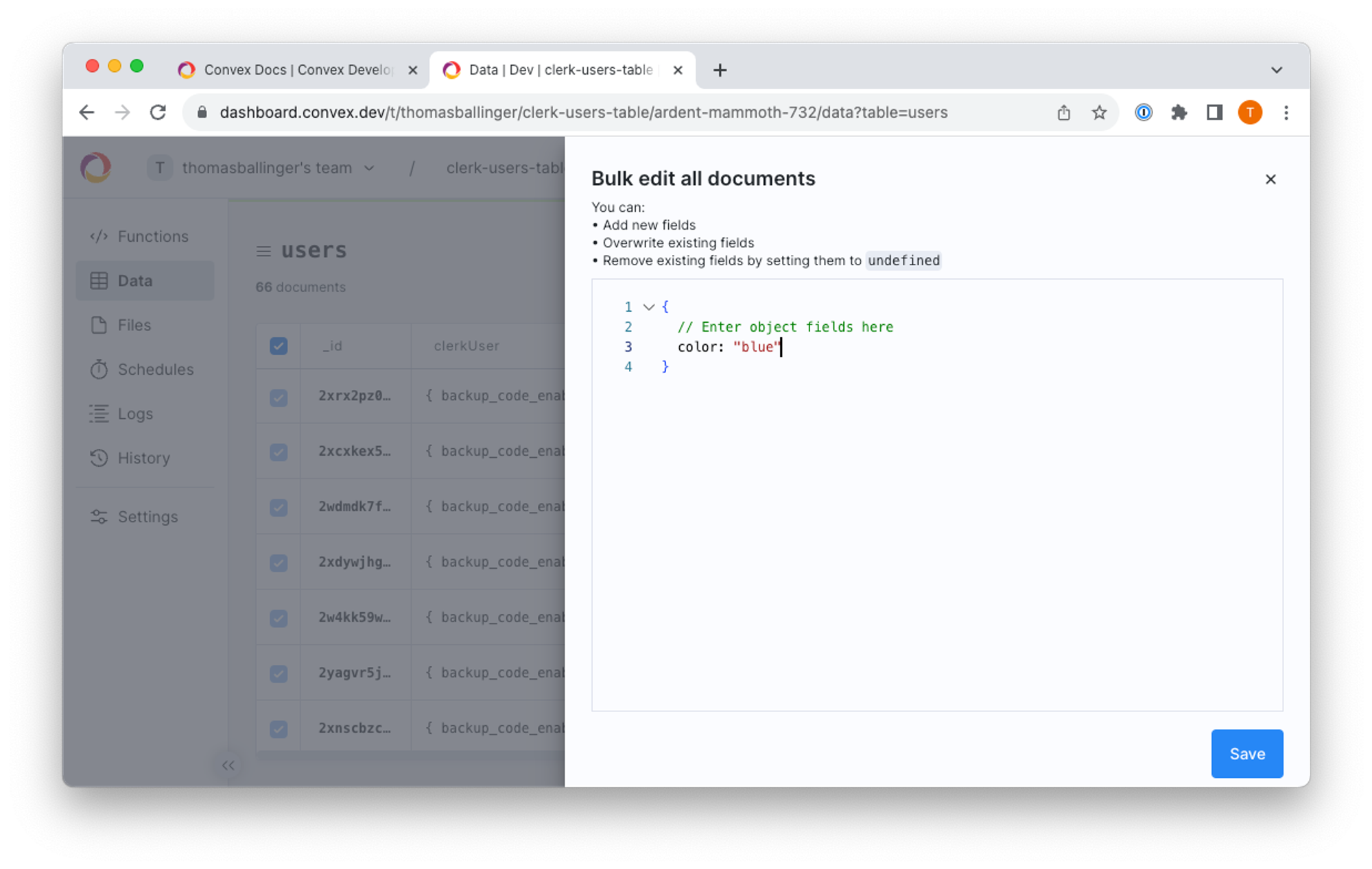 Select all rows in a table and modify them all at once! Bulk editing is a cheap migration alternative when your data is small enough to be loaded in a single transaction. If the data is too large for a single transaction, the change will not succeed and you’ll still need to write a migration with Convex functions. However, this makes quick data changes lighter weight, especially early in a project.