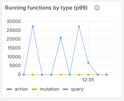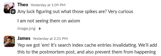 Even with search indexing causing needless traffic spikes and too-simplistic client backoff hammering our platform, Convex would have powered through the work no problem once we had given the backend a bigger query queue. We know because that's exactly what it did at 12:27p.