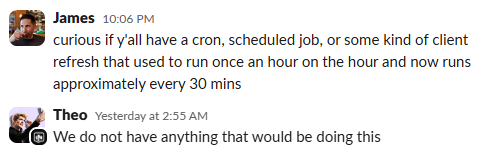 11a-12p: The thundering herd continued to just overwhelm the T3 Chat Convex deployment. We honestly could not figure out what was happening. We profiled the app and found several optimization opportunities to speed up the Convex engine. But even though each one made things run a little faster, and T3 Chat almost fully recovered despite the thundering herd, it never returned to equilibrium. In desperation, we prepared to block ranges of IPs at the traffic level to allow all the clients to finish syncing, forcing a kind of backoff + jitter.