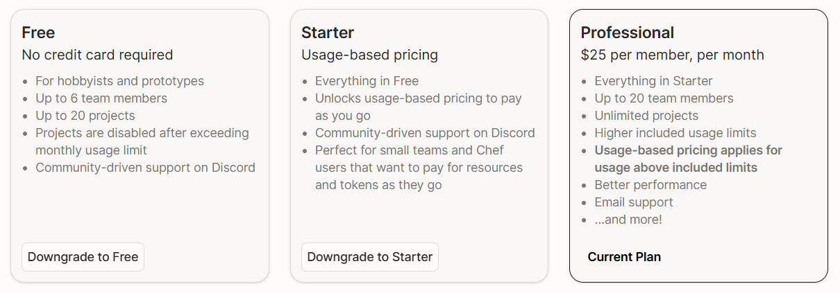 We're also making Convex Starter the default upgrade flow in Chef. In general, new Chef users don't need all the features and high built-in infra resources in Convex Pro. They often don't know those features exist and don't care! So they shouldn't pay for them.