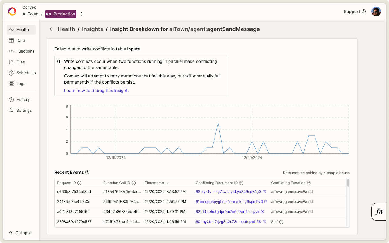 Convex is designed to guide people in writing correct, high-performance backends. We’re taking this further with proactive insights on the dashboard for growing apps. Insights will tell you which functions are about to hit read limits or have write conflicts. You’ll get detailed information on why and how to fix it.