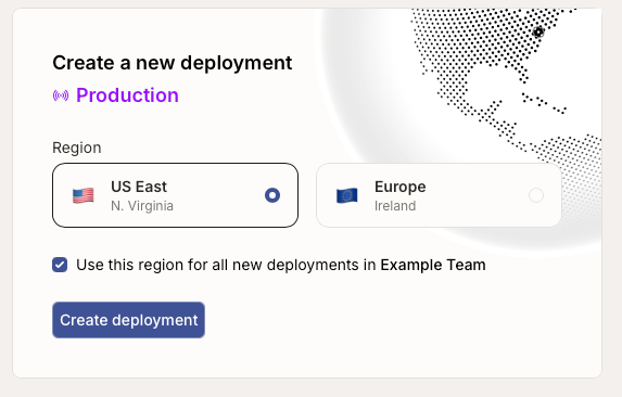 Getting started with an EU deployment is easy: the Convex Dashboard now includes a region selector when you create a project or deployment, and the Management API supports it too. And for CLI folks (and agents), a --region flag is coming next week. Deployments can’t yet migrate regions automatically, so you’ll need to use backup and restore to move an existing deployment.